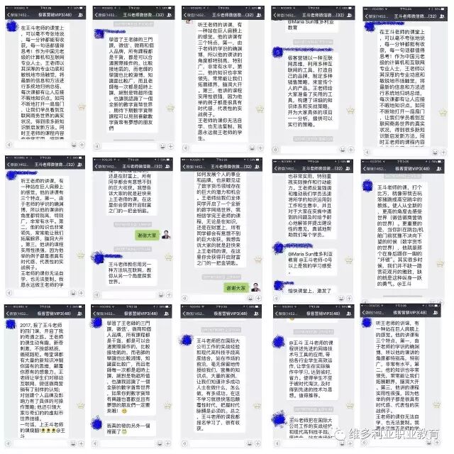 【学员 Michelle】我听完王斗老师的公开课后,第一感觉就是王老师讲授的课程内容太有用了,这就是我目前最想学习和最想掌握的知识,所以就马上报名参加王斗老师的所有课程的学习,我们已经上完了微信,微商,个人品牌。王斗老师是微信微商的领军人物,在教授我们课程的两三个月的时间里,王老师给我们全体同学开启了一个全新的数字网络世界,我相信学完王老师的课程,无论是在知识,还是在财富上,所有同学都会有意想不到的巨大收获。我想告诉大家的就是赶快来上王老师的课,在这里你会获得开启财富之门的一把金钥匙。